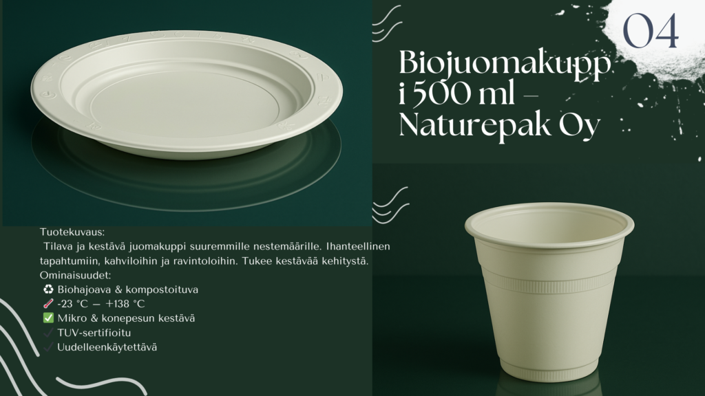 Yrityksemme tuotteet on suunniteltu kestämään -23 °C – +138 °C lämpötiloja, ja ne soveltuvat niin mikroaaltouuniin kuin astianpesukoneeseenkin. Tuotteemme ovat uudelleenkäytettäviä, TUV-sertifioituja ja täysin kompostoituvia – täydellinen valinta niille, jotka haluavat vähentää ympäristövaikutuksiaan ilman kompromisseja laadussa.